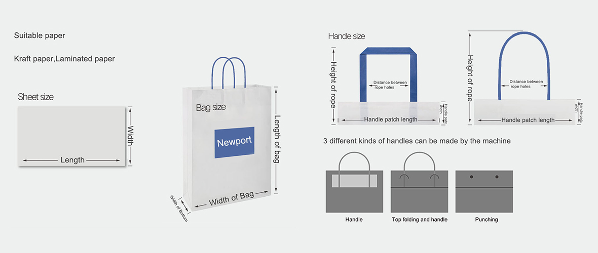 Fully Automatic Sheet Feed Type Square-Bottom Bag Making Machine adopts sheet-feeding mode. Handles are made by roll paper reinforced card and paper rope. The whole process are completed in one pass by feeder conveying, handle making, handle pasting, bag mouth folding, bag tube creasing, tube forming, square bottom forming and paper bag counting and collecting, thus reduce the labor effectively and increase the efficiency.